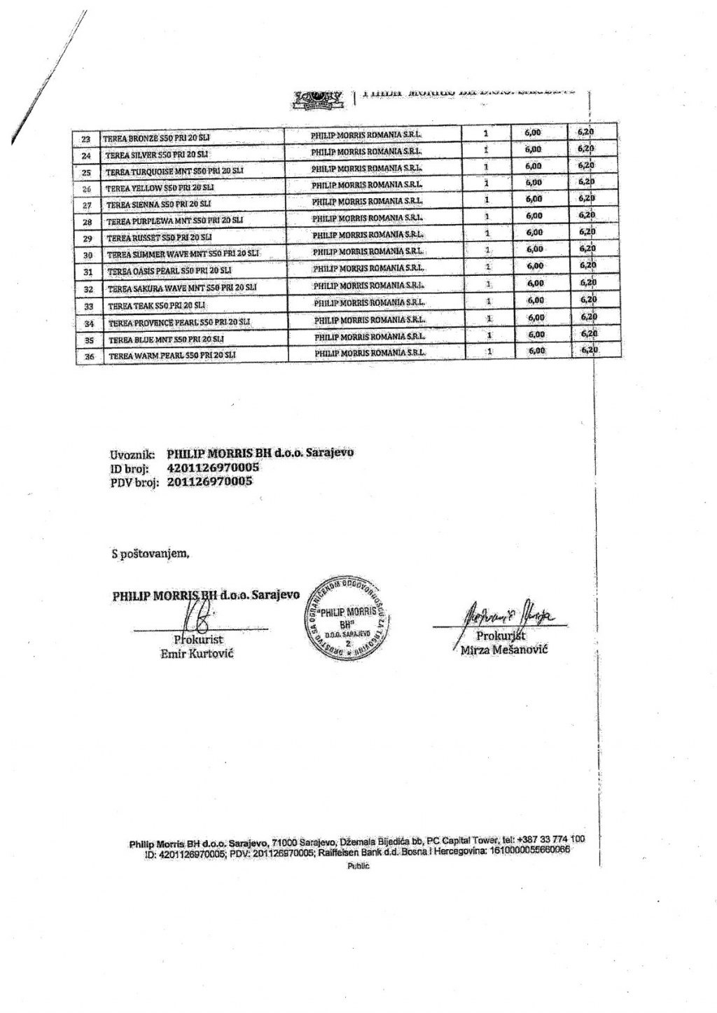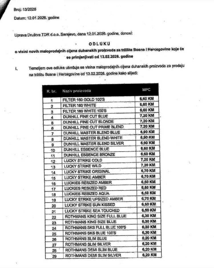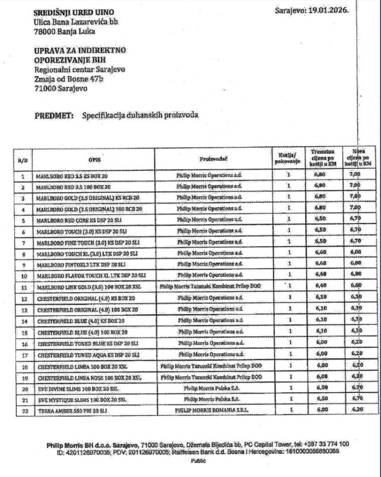 Нове цијене цигарета Управи за индиректно опорезивање (УИО) БиХ доставили су ТДР Сарајево, Филип Морс, те Нелт.